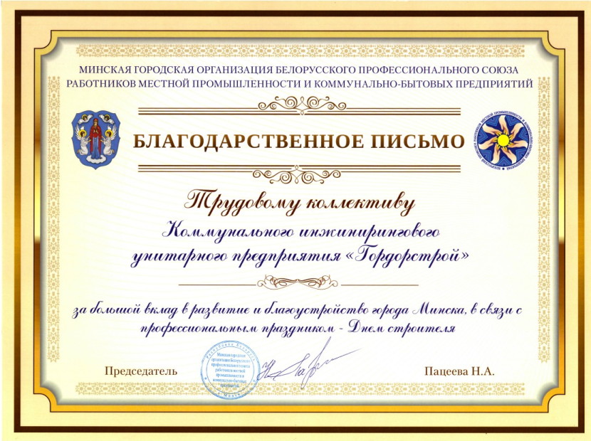 Падзячны ліст за ўклад у развіццё і добраўпарадкаванне горада